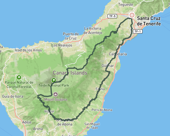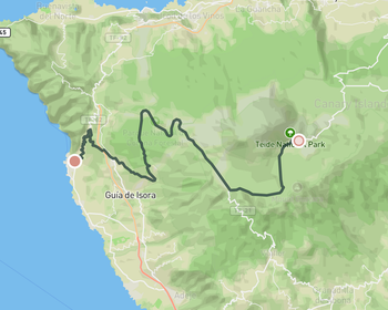 Leaving from La Laguna puts you on the climb right from the start. After around 40 kilometers, you’ll reach El Portillo, with only a short stretch of climbing left near the top of El Teide. From there, descend through Vilaflor and ride about 80 kilometers parallel to the coast on scenic, winding roads.