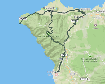 This route brings big climbs and some of the best views of the island. Roll out from Los Gigantes and climb up to Erjos. From there, a beautiful descent to the coast is waiting. Ride toward Buenavista del Norte, and if you’re feeling strong, keep going to the Punta de Teno Lighthouse at the island’s western tip. From the coast, a winding climb takes you up to Mirador Altos de Baracán, then on to Masca and Mirador de Cherfe.
