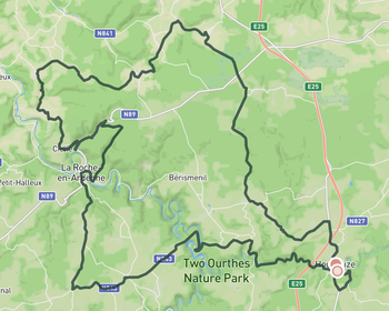 Set out from Houffalize for this 90 km ride. It’s all ups and downs almost no flat cruising here. Midway through, you’ll climb the Col de Haussire, a climb that always makes an impression.