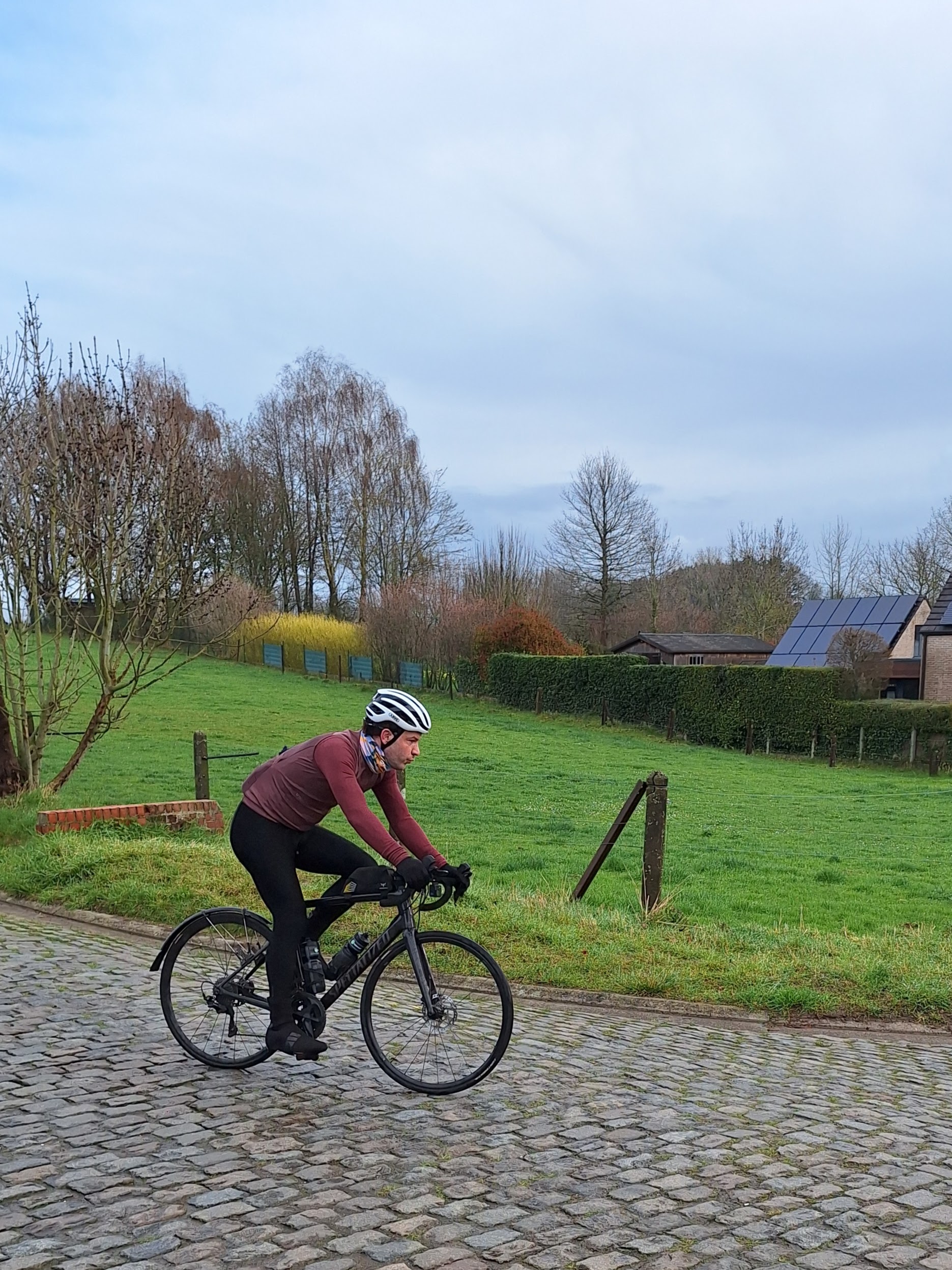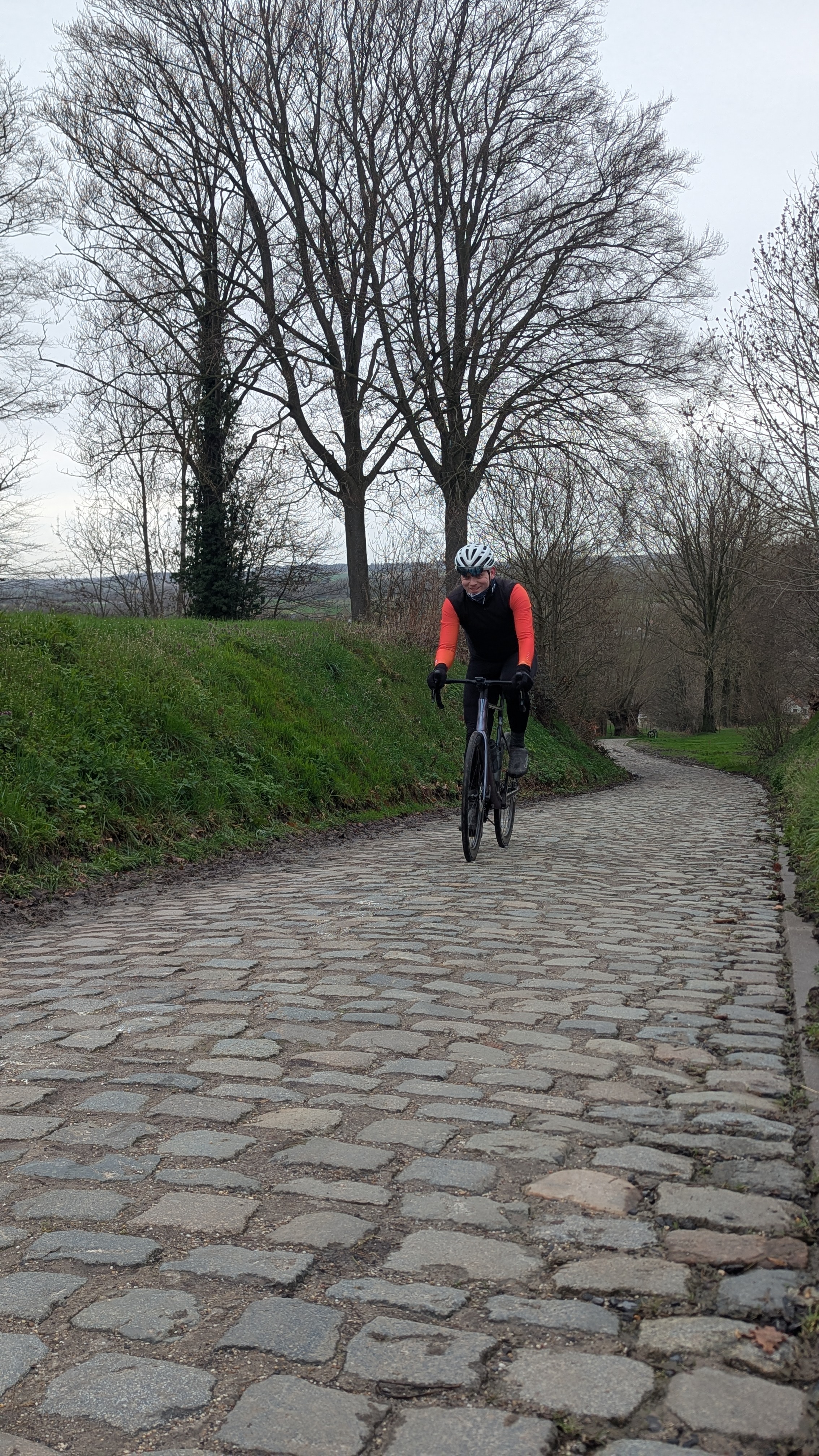 We rolled out along the cycling path next to the Scheldt river, a flat and easy warm-up toward Kluisbergen. Then we turned left and hit the Oude Kwaremont, our first proper cobbled climb of the trip.